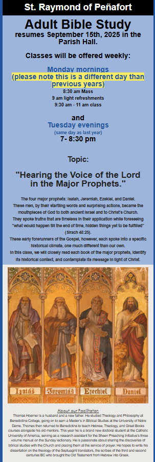Below is the curriculum for the 2025-2026 Provisional Schedule for Major Prophets Study St. Raymond de Penafort Thomas Hoerner First Semester: Week 1 (September 15) Introduction to Major Prophets Week 2 (September 22) Call of Jeremiah (Jer 1, 36) Week 3 (September 29) Call of Ezekiel (Ezek 1-3) Week 4 (October 6) Daniel 1-6, 13-14 Week 5 (October 20) Call of Isaiah (Isa 1-6) Week 6 (October 27) Isaiah 7-12 Week 7 (November 3) Isaiah 13-23 Week 8 (November 17) Isaiah 24-35 [SBL/Thanksgiving Week] Week 9 (December 1) Isaiah 36-39 Christmas Break Second Semester: Week 10 (Feb 2) Ezekiel 4-24 Week 11 (Feb 9) Ezekiel 25-32; Jeremiah 46-51 (Faith and Bible Q&A) [Beginning of Lent] Week 12 (Feb 23) Ezekiel 33-39 Week 13 (March 2) Jeremiah 2-17 [CUA Spring Break] Week 14 (March 16) Jeremiah 30-35 Week 15 (March 23) Jeremiah 18-29; 35-45 Week 16 (March 30th, Holy Week) Isaiah 45-55 [Beginning of Easter] Week 17 (April 13) Isaiah 40-44; Book of the Prophet Baruch Week 18 (April 20) Isaiah 56-66 Week 19 (April 27) Ezekiel 40-48 Week 20 (May 4) Daniel 7-12